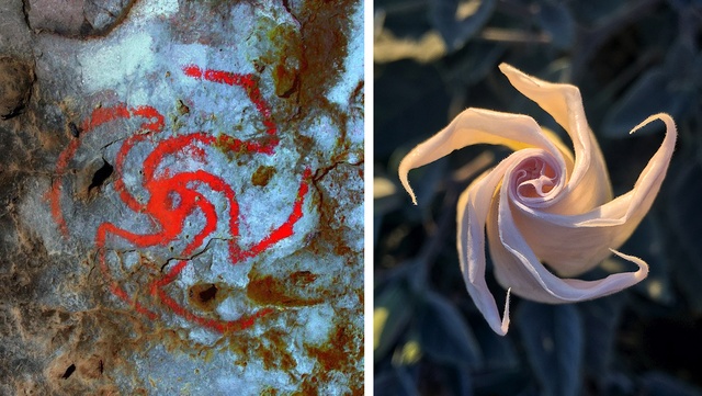 A painting on the ceiling of Southern California's Pinwheel Cave, left, and a datura flower.