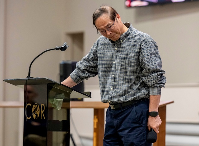 Pastor Billy Chang spoke during a vigil at Christ Our Redeemer AME Church in Irvine on May 16.