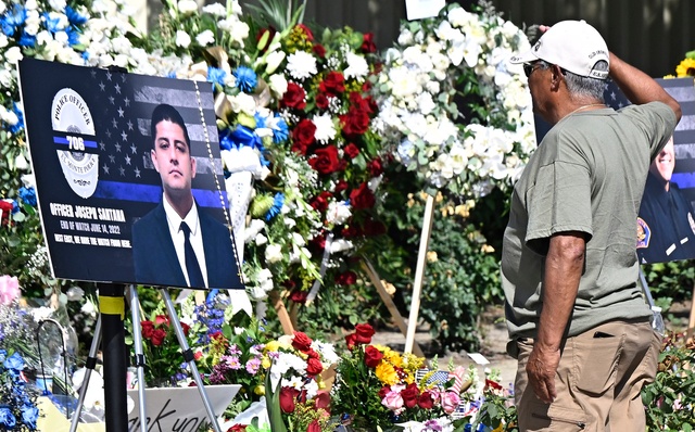 A man saluted a memorial for Officer Joseph Santana in El Monte on Wednesday.
