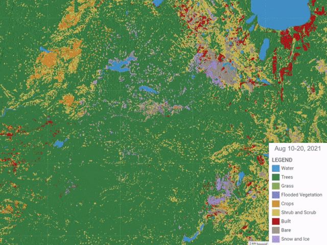 Google released a new tool on Thursday that uses real-time satellite imagery to depict what's on Earth's surface at super-high resolution. Dubbed Dynamic World, it displays nine color-coded land cover types such as buildings, grass, and crops in 10-by-10-meter squares. One powerful application is the visualization of landscapes altered by wildfire. The Verge