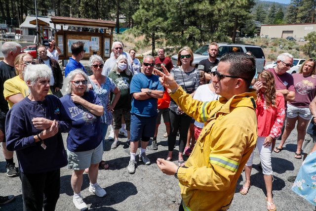 Battalion Chief Mike McClintock briefed residents on the Sheep fire in Wrightwood on Monday.