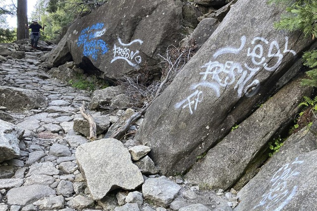Vandals spray-painted more than 30 sites across Yosemite National Park last month, officials said on Sunday. Photos posted online showed boulders along the popular Yosemite Falls Trail scrawled with the word "Fresno" and other illegible writings in blue and white paint. The park asked the public for help in identifying suspects. Sacramento Bee | A.P.