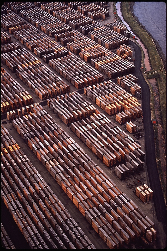 Lumber was stacked by a river in Humboldt County in 1972.