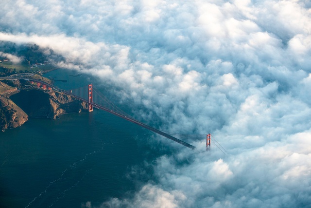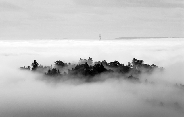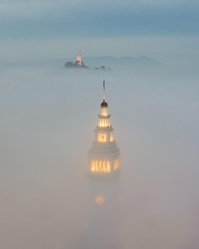 The metaphor comes to life with the city’s signature fog, which pours over the hills in slow-motion waves of white. On the ground, the experience can be dreary, “like living inside a great gray pearl,” as Herb Caen once put it. But viewed from above, the fog resembles the sea itself, upon which bits of the skyline appear like lighthouses or ship masts.